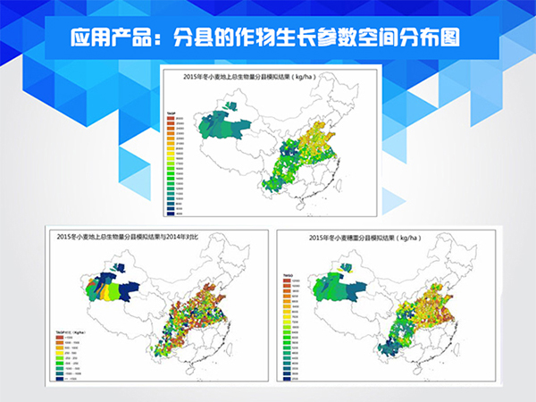 經過3年多的努力,國家氣象中心實現了作物模型的全面業務化應用,其中包括冬小麥干熱風災害影響定量評估、華北夏玉米干旱解除預評估、作物產量動態和定量氣象預報等;同時,玉米、水稻、小麥葉面積指數、生物量和穗重的逐周模擬產品也在國家氣象中心業務網站上定期發布。